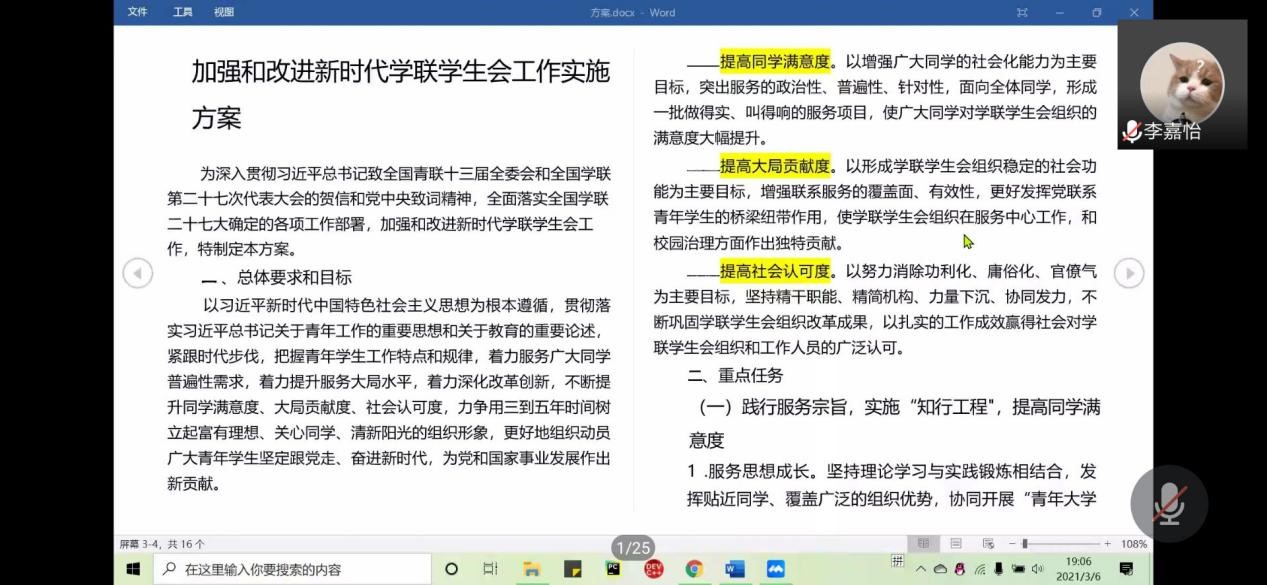 举目远眺望,思想铸篇章。2021年3月6日傍晚7时,计算机科学与技术学院团委学生会线上举行了《加强和改进新时代学联学生会工作实施方案》主题学习会。全体团委学生会成员积极参与会议,认真聆听学习,牢记指导思想,加强改进工作。