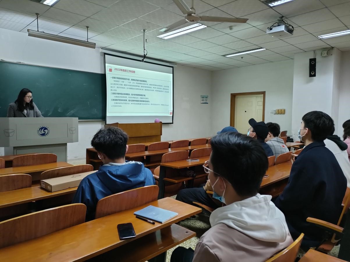 王禧同学主要从“回顾两会历史”、“从历史两会看今日两会”、“2022年两会精神聚焦”这三个方面带大家学习两会会议精神。王禧同学讲到,今日两会是关注民生、关注科技、面向全球的两会,做到了政策与民意相汇、会议与科技相结合、中国与世界相结合。