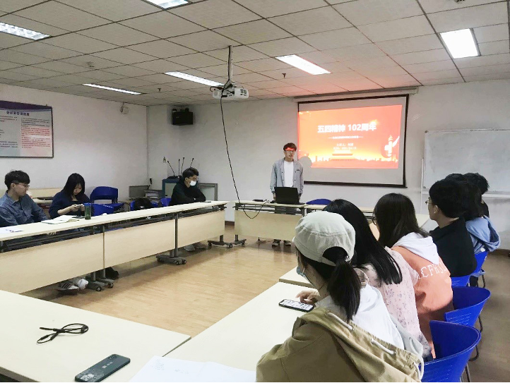 研会文艺部负责人刘潇是本次活动的主讲人。他首先从五四运动的历史脉络讲起,追溯五四精神的源泉,向参会人员讲述了五四运动前后的爱国故事和当代研究生抗击疫情、弘扬五四精神的感人事迹。接着,大家就如何在新时代学习传承五四精神展开讨论。计算机研201班团支书袁欣如认为,五四精神不应当是停留在观念或表达层面的口号,而应当变成一种以理想主义精神引领实际行动的行为模式。