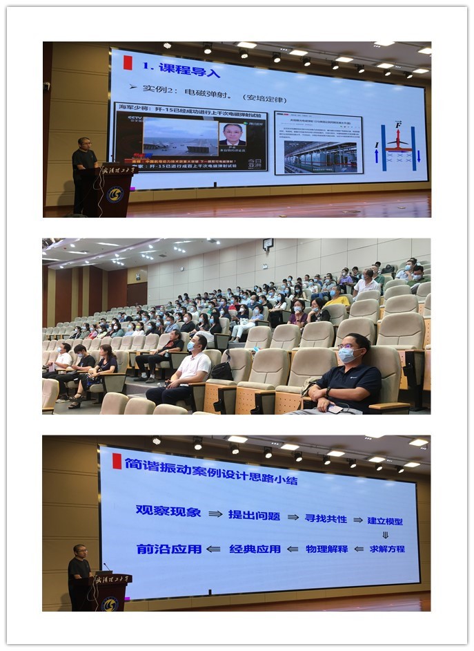 吕老师结合自己参加青年教师教学能力竞赛的经历,从教学设计和教学实践两个方面,介绍了自己的教学设计总体思路。他或是从国家大事,时事新闻,或是从网红视频,反常识现象等途径进行课程导入,同时加入课程思政元素,通过提出问题,引发同学们的思考,大家一起猜测答案,然后根据实验测量或理论计算,寻找答案,发现规律,形成新的模型或表述,最后考察成立条件,适用范围等加以运用,解决实际问题,以此来培养学生们的科学思维方式和创新能力。吕老师制作的PPT也非常简洁清晰,他设计引用了大量的动图和图表,配合着他深入浅出的讲解,将枯燥的理论知识阐述的生动有趣。我院教师们听的津津有味,时不时的拿起手机记录下他们感兴趣的片段。大家纷纷表示,年轻教师思维活跃,乐于思考,与时俱进的态度值得大家学习,更重要的是对教学的热爱和坚守,是新时代高校教师学习的榜样。我们更应自觉加强自身政治理论学习和业务能力提升,争做有理想信念、有道德情操、有扎实学识、有仁爱之心的“四有”好老师。