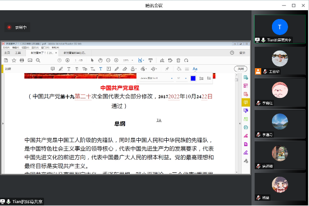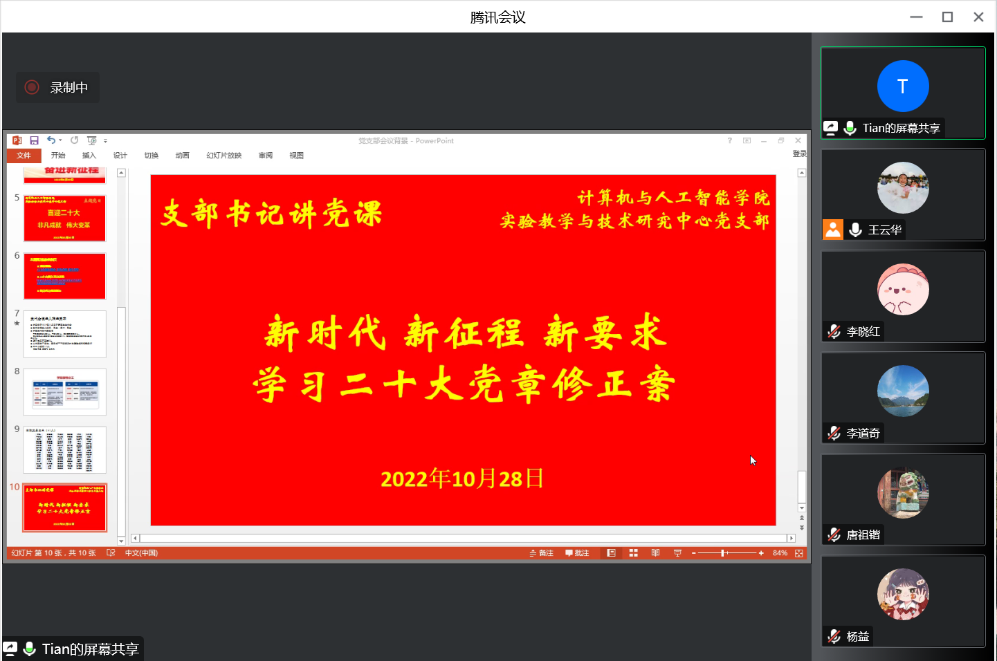 2022年10月28日,实验教学与技术研究中心党支部开展支部书记讲党课活动,支部书记田璟同志主讲了题为“新时代、新征程、新要求,学习二十大党章修订案”的主题党课,和支部同志一起就党章的最新修正部分进行了学习。