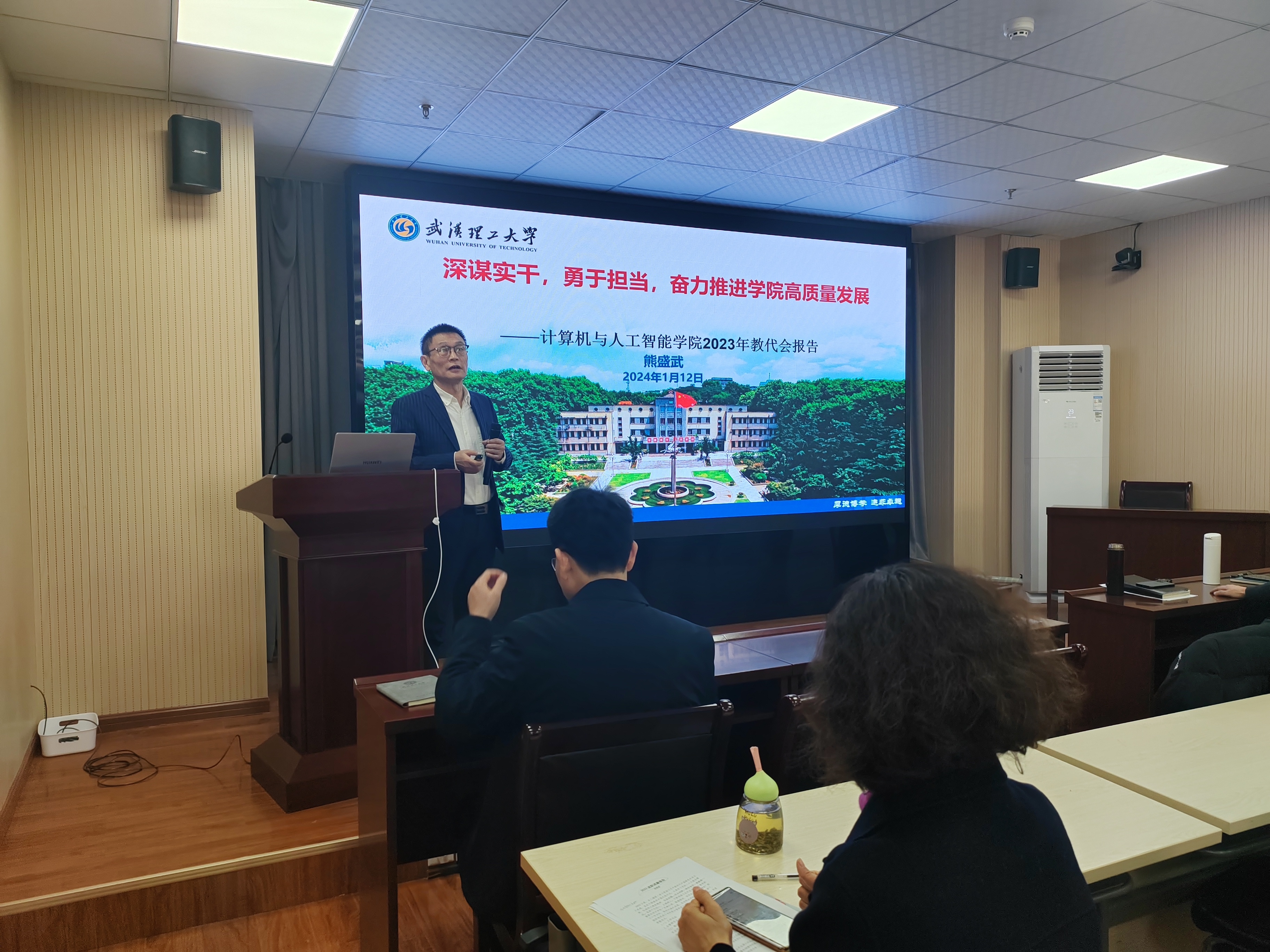 2024年1月12日,学院在学海510报告厅召开第四届教代会暨工代会第四次会议,学院教代会代表、工会会员代表参加,会议由学院党委书记、工会主席张晓寒主持。
