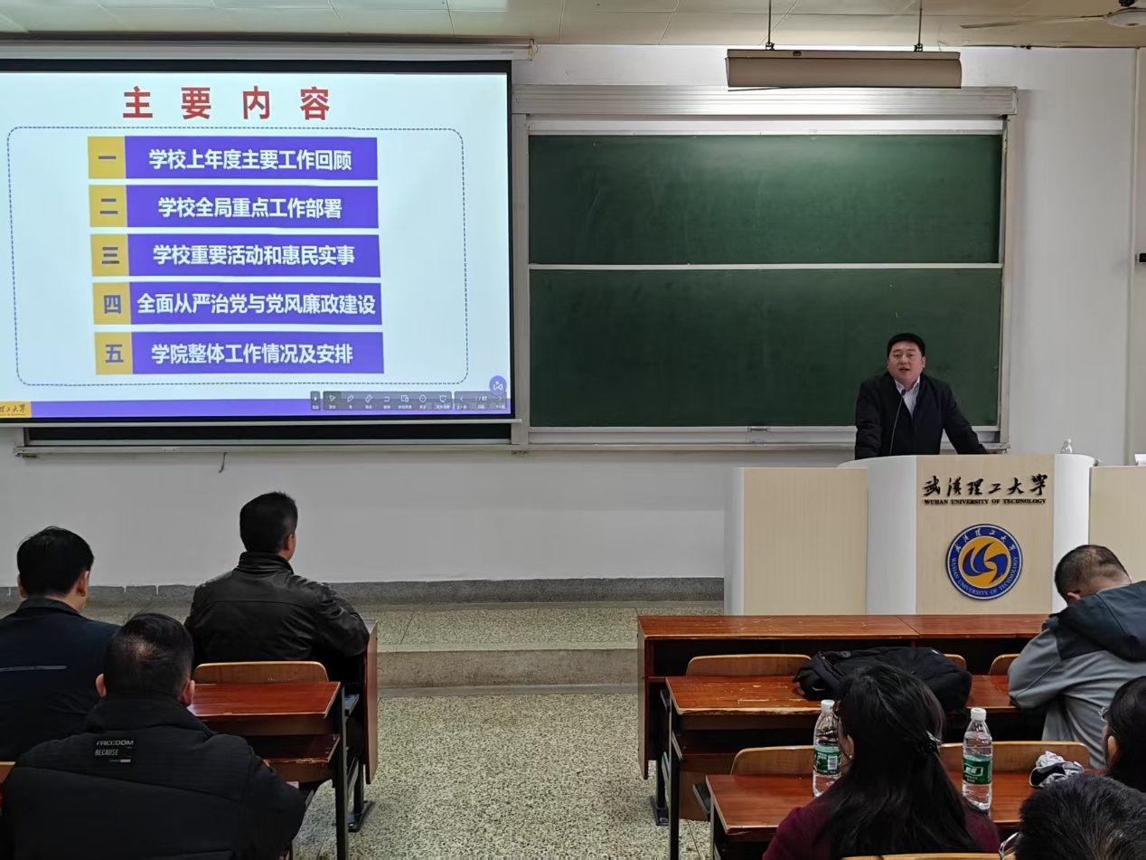 院党委书记陈采军传达了信思金在2025年学校工作布置会上的讲话精神,并围绕坚持党建引领、坚持提质增效、坚持强本固基“三个坚持”,全面部署了学院2025年党建工作目标和任务,号召全院上下要继续以习近平新时代中国特色社会主义思想为指导,确保各项重点工作落地见效,为学院高质量发展贡献智慧和力量。