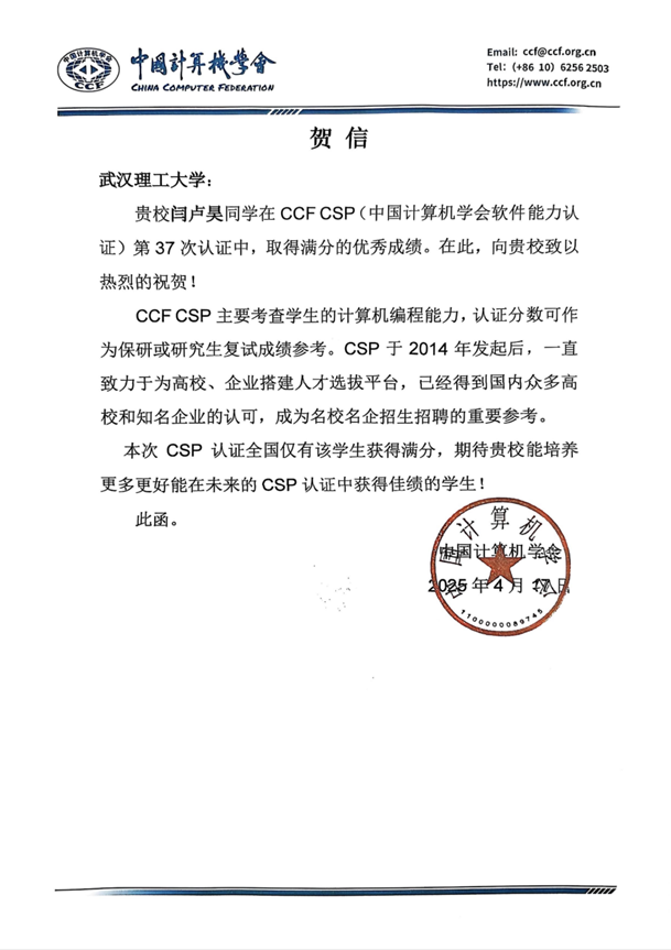 闫卢昊同学以满分500分的优异成绩脱颖而出,成为本次认证中全国唯一一位满分获得者,展现了学校在计算机领域人才培养的卓越成效。