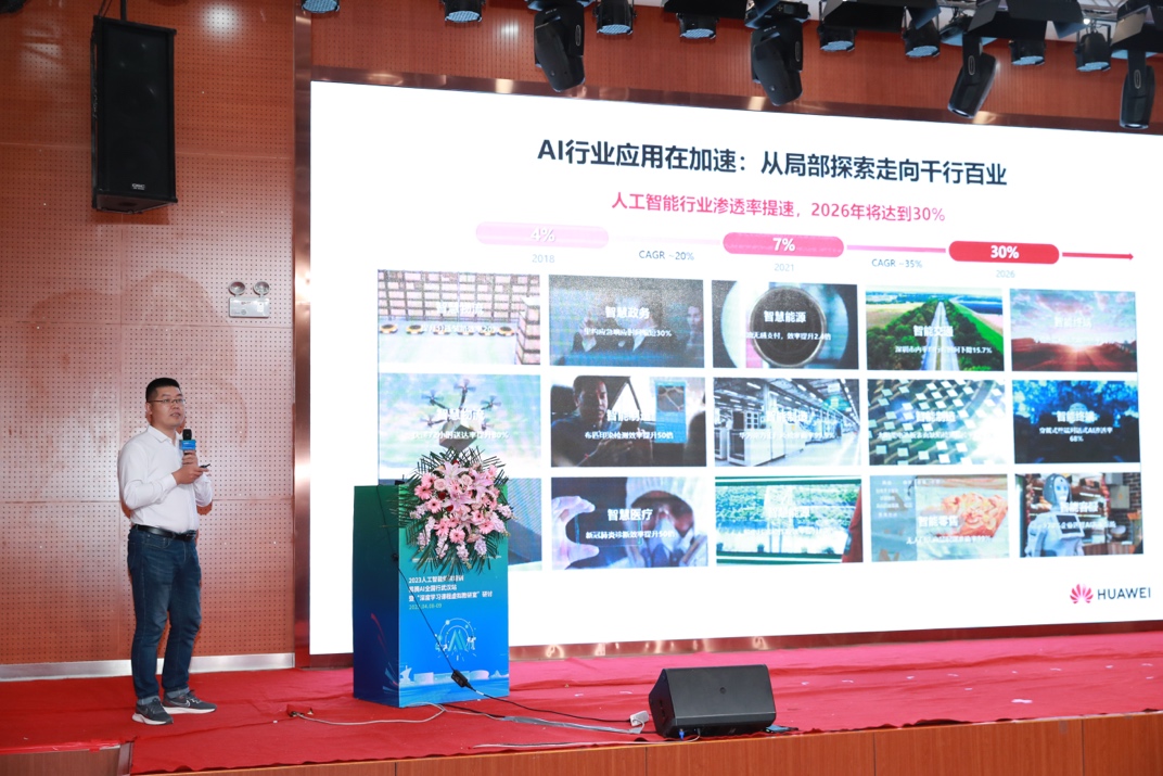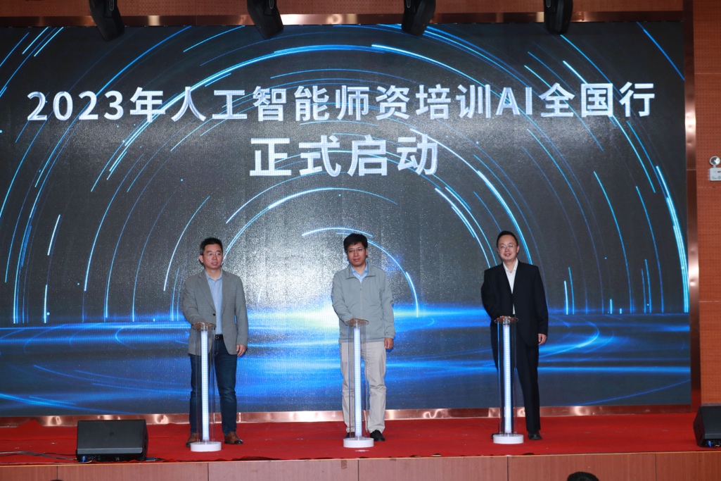 随后在成人影视片 副院长石兵主持下,与会领导嘉宾成人影视片 副校长刘春江、信息技术新工科产学研联盟副秘书长计卫星、昇腾生态发展部副部长张存燕共同启动“2023人工智能师资培训AI全国行”仪式。