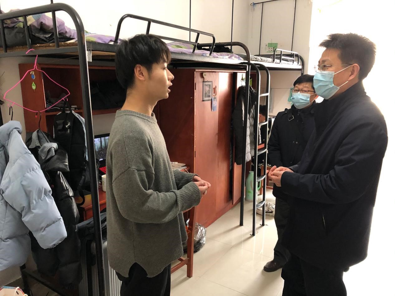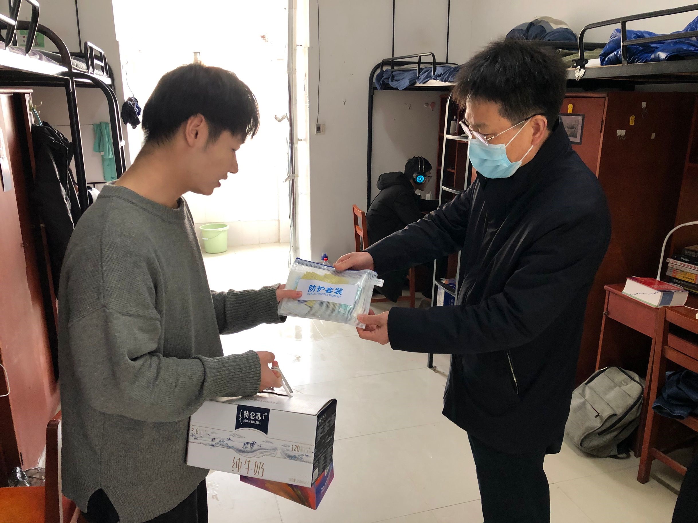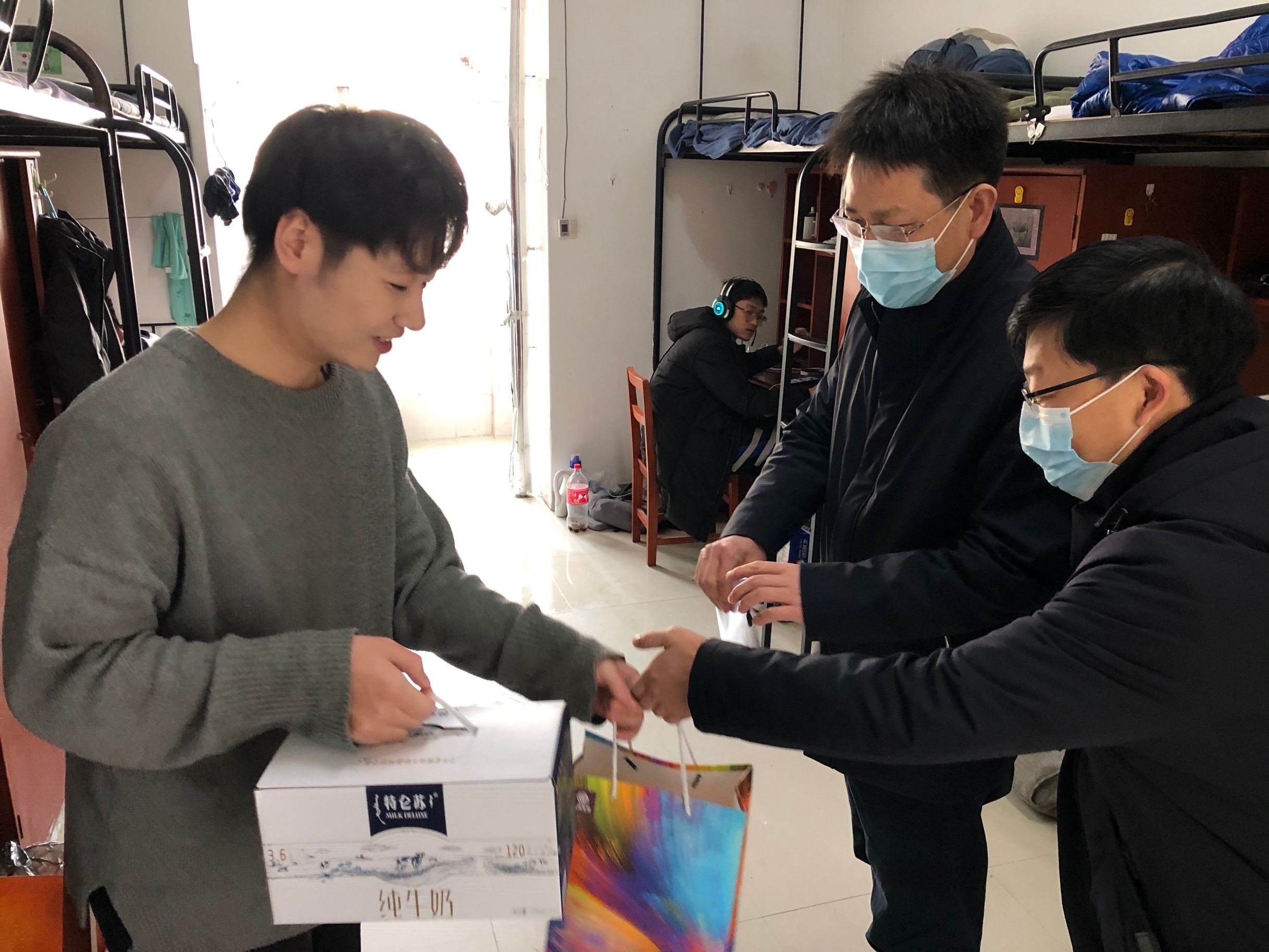 心系学生发展,注重学生健康,给予学生冬日的温暖,2021年1月16日上午,计算机科学与技术学院党委书记张晓寒、党委副书记徐小波、辅导员石林走访慰问我院因疫情滞留在校的学生,给学生送去生活用品和当下急需的口罩、消毒液等防疫物资。