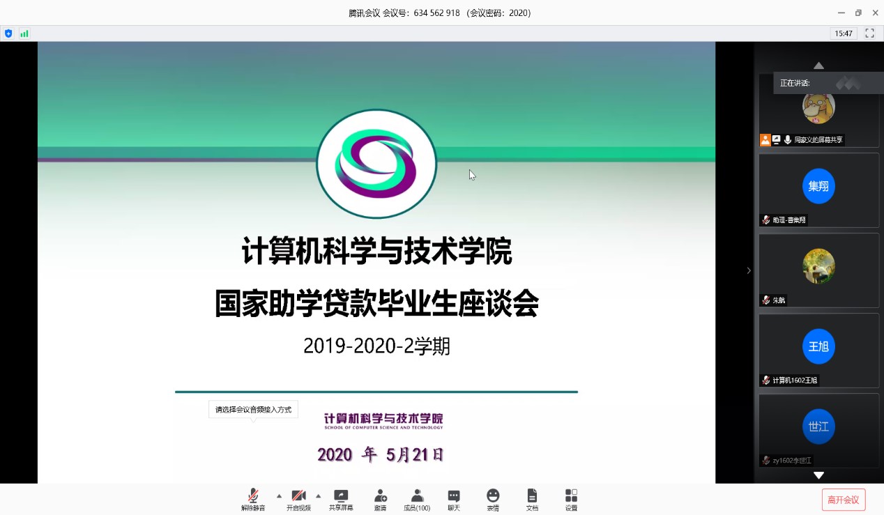 为普及征信知识,引导学生树立诚信意识,促进毕业生国家助学贷款还款工作顺利开展,5月21日下午,计算机科学与技术学院举行了线上国家助学贷款毕业生座谈会。本次会议由周豪义老师与张艺老师主持,全体2020届办理国家助学贷款的毕业生参会,本次会议还特别邀请学工部资助与服务中心赵得江老师参与,为学生答疑解惑。