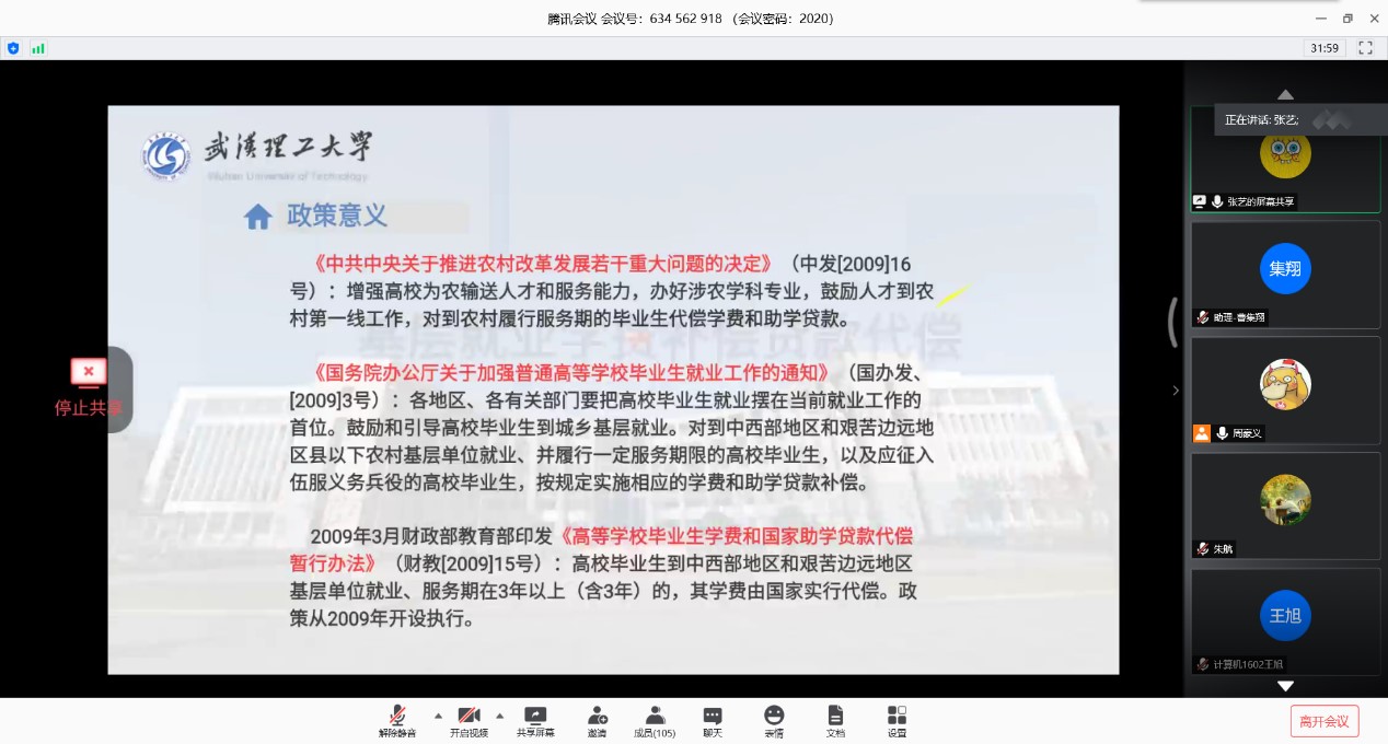 随后,周豪义老师为与会毕业生全面解读提前还款、国贷再贴息申请等相关政策,安排部署疫情期间相关材料审核提交的具体流程,并指导学生签署了《中国银行股份有限公司国家助学贷款还款协议》及《中国银行湖北省分行国家助学贷款毕业生(借款人)资料确认书》。同时提醒每位贷款毕业生要树立诚信意识、征信意识,珍视个人的信用记录,明确个人应承担的责任和义务,履行贷款合同约定,按时归还贷款利息和本金。会议最后,几位老师也对贷款学生遇到和提出的各种问题进行了细致的解答。